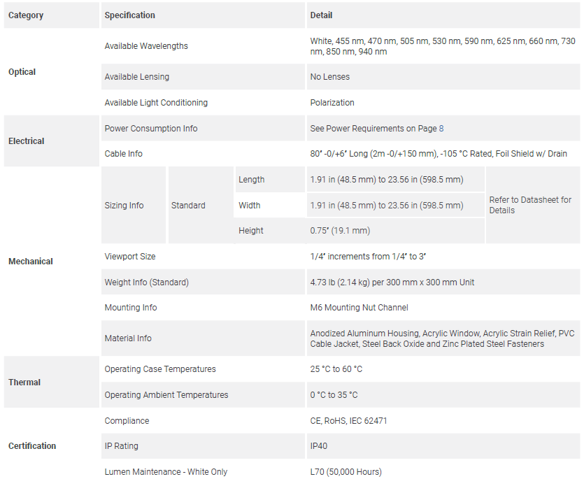 The FX2 is available in sizes from 50 mm x 50 mm up to 600 mm x 600 mm in 25 mm increments. It is offered in 11 wavelengths, with optional polarization to help reduce glare on reflective surfaces, and can be specified with a central viewport for select front lighting applications.