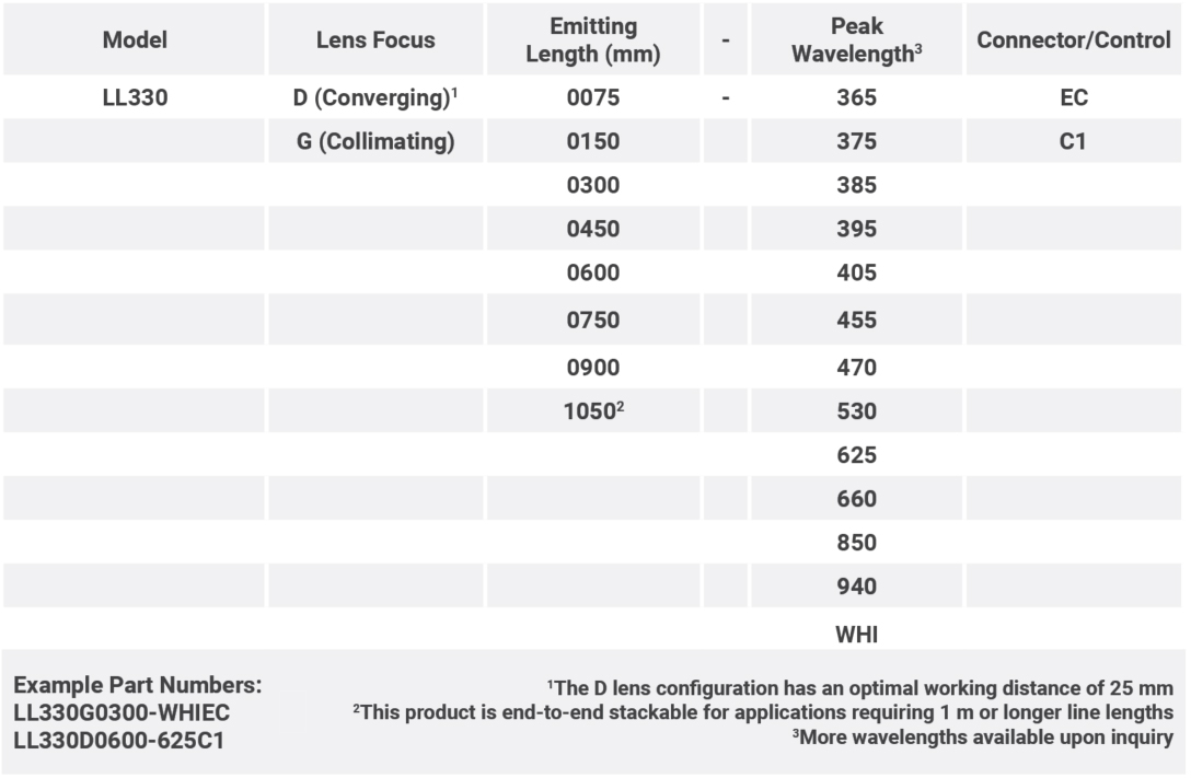 The LL330 Series provides a sealed high intensity line light solution for demanding industrial environments. Engineered to withstand harsh conditions, these line lights are completely protected from dust and debris, ensuring reliable performance where other lights fail. In addition, passive thermal management eliminates the need for active cooling fans, contributing to low-maintenance, long-term operation.